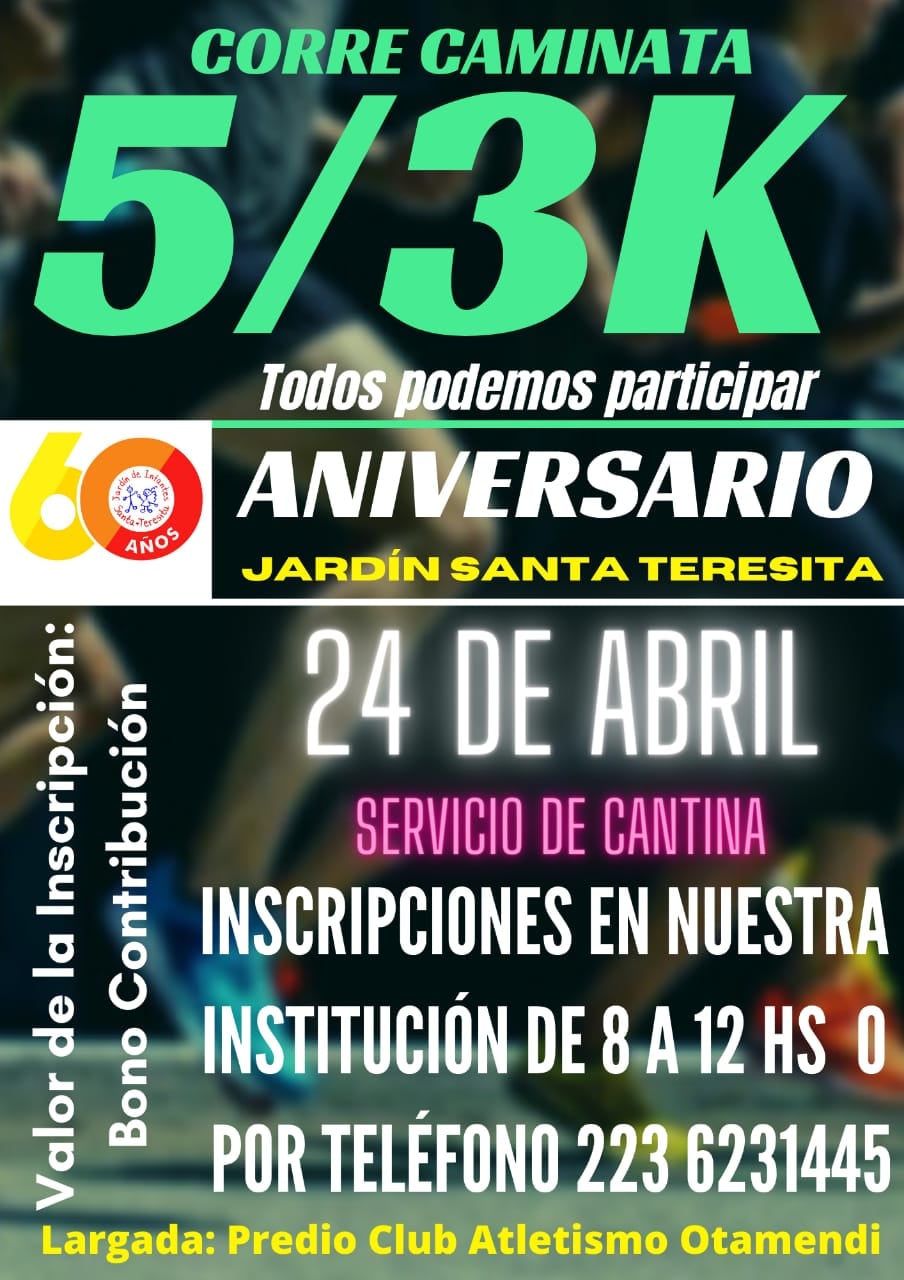 Corre Caminata 5/3K por noticiasdeotamendiPublicado en27 marzo, 202229 marzo, 2022 Todos podemos participar60 Aniversario Jardín Santa Teresita24 de Abril Inscripciones en nuestra institución de 8 a 12 hs o por teléfono 223 6231445Largada: Predio Club Atletismo OtamendiValor de la Inscripción: Bono contribución Servicio de Cantina