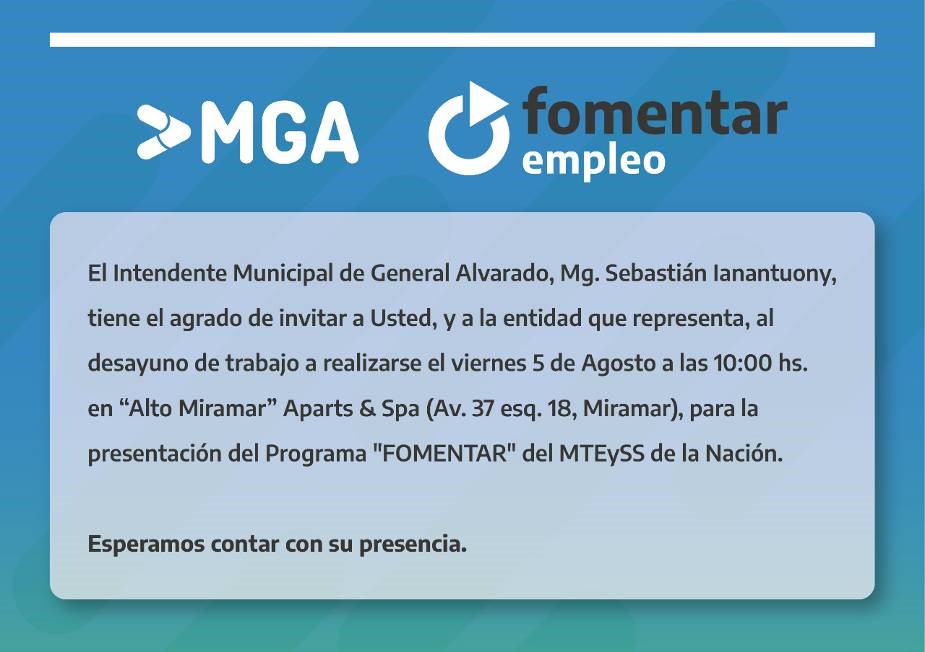 El Intendente Municipal de General Alvarado, Sebastián Ianantuony, junto a la Directora de Empleo MGA, María Laura “Lali” Banús, y funcionarios del Ministerio de Trabajo, Empleo y Seguridad Social de la Nación, se reunirán este viernes 05 de Agosto, a las 10:00 hs., en “Alto Miramar Apart & Spa” (Av. 37 y 18), en un desayuno de trabajo con empresarios de General Alvarado, para la presentación del programa “Fomentar Empleo”.
