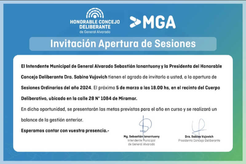 El Intendente Municipal de General Alvarado, Sebastián Ianantuony, y la Presidenta del H. Concejo Deliberante, Dra. Sabina Vujovich, tienen el agrado de invitar a la Apertura de las Sesiones Ordinarias 2024, que se llevará adelante este martes 05 de Marzo, desde las 18:00 hs., en el recinto del Cuerpo Deliberativo (calle 28 Nº 1090, Miramar).