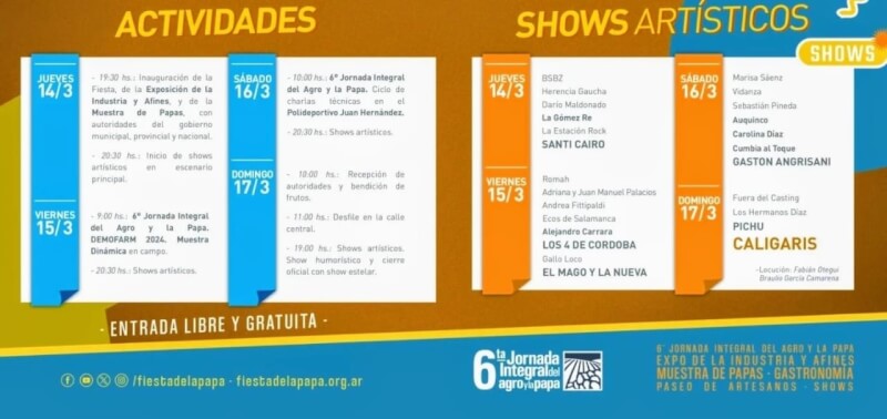 El viernes y sábado desde la mañana, se llevará a cabo la Jornada Integral del Agro y la Papa, con muchos visitantes y expositores de la materia. Ambos días, también, se cerrará con espectáculos musicales.