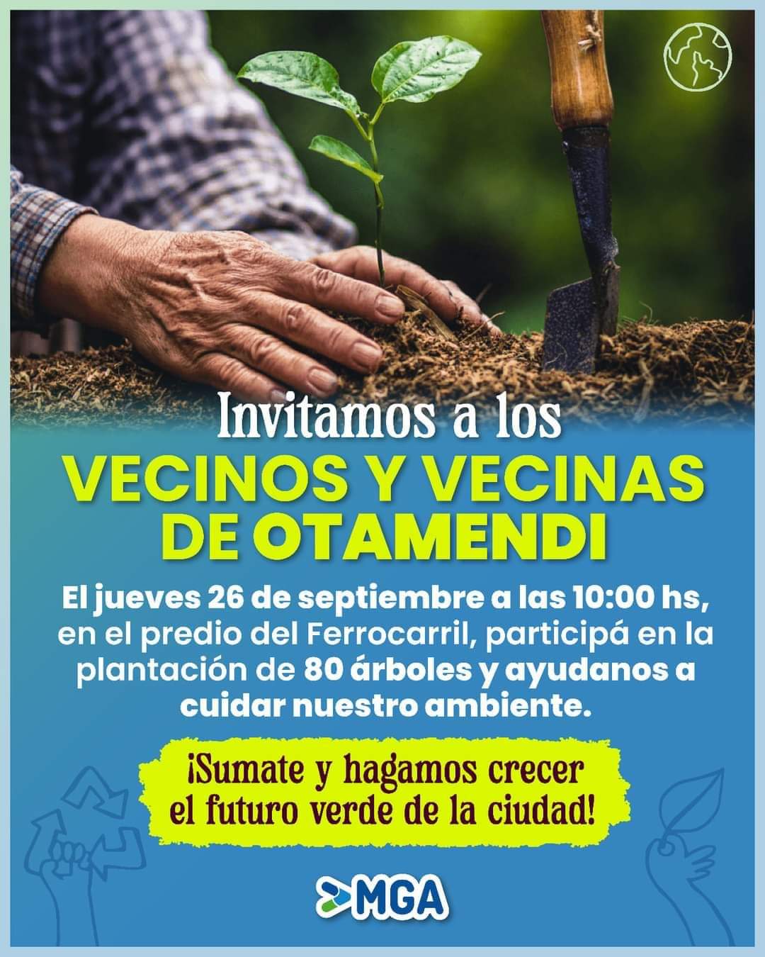 Invitamos a los vecinos y vecinas de Otamendi el jueves 26 de septiembre a las 10:00 hs, en el predio del Ferrocarril, participá en la plantación de 80 árboles y ayudanos a cuidar nuestro ambiente.