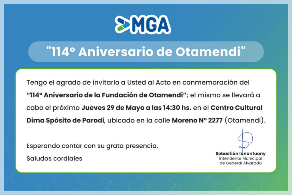 Con motivo de celebrarse el 114° Aniversario de la Fundación de Comandante Nicanor Otamendi, tenemos el agrado de invitar a la comunidad al Acto Protocolar, y espectáculos artísticos que se realizarán en el Centro Cultural “Dima Spósito de Parodi” (Moreno 2277), mañana jueves 29 de Mayo desde las 14:30 hs.