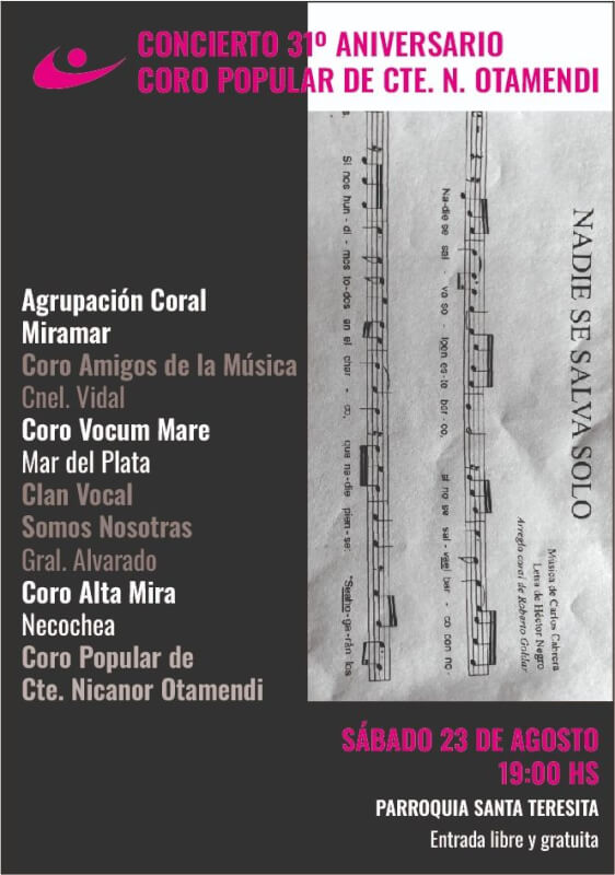 Concierto 31° Aniversario Coro Popular de Cte. N. Otamendi por noticiasdeotamendiPublicado en21 agosto, 202525 agosto, 2025 Sábado 23 de agosto, 19:00 hs Parroquia Santa Teresita Entrada libre y gratuita