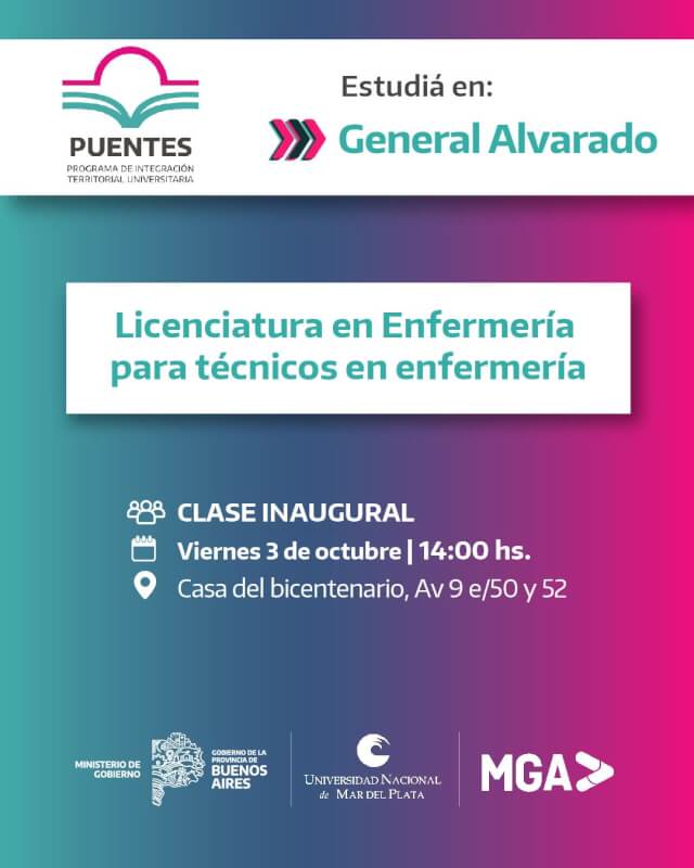 La clase inaugural se dictará en la Casa del Bicentenario (Av. 9 e/ 50 y 52, Miramar), permitiendo este nuevo trayecto formativo continuar con el desarrollo académico de los y las enfermeras técnicas, ampliando sus conocimientos y abriendo nuevas puertas en el ámbito laboral y de la salud.
