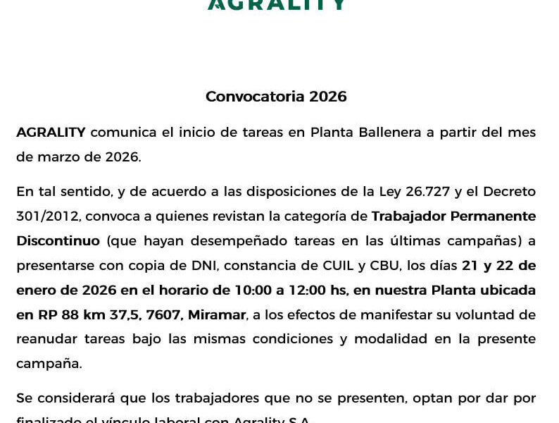 AGRALITY comunica el inicio de tareas en Planta Ballenera a partir del mes de marzo de 2026. En tal sentido, y de acuerdo a las…